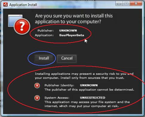 AIRインストーラーでインストールする場合、下記のような画面が表示されますので、Install を押して進んでください。 この例のように、赤丸で示したところに英語版であれば、" Publisher: UNKNOWN " と出ますが 、そこは私が使用しているデジタル署名を専門登録会社に登録していない為 このように UNKNOWN (データベースで照会できなかった) となってしまいます。